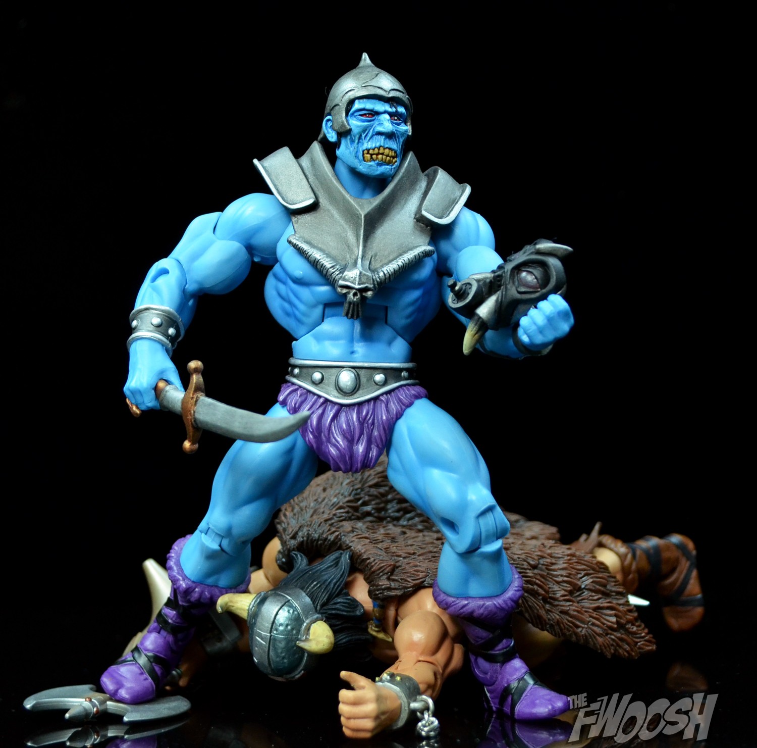 Monstor is a completely new character, and with that comes a refreshing ability to “choose your own adventure” in terms of characterization. I like that Jim Pansen is allowing the kit to kind of speak for itself, and has not added any written development because that really leaves the door wide open. When I first saw pictures of Monstor, my mind went right to him being an undead character. That was based on the look (the original green), of course, but also because that helps facilitate something that we don’t have a lot of in MOTU. Zombies and the undead seem to come at a bit of a premium on Eternia, so I am really happy to have this guy fill the void, and, to me, the blue represents the second stage of this character’s powers.